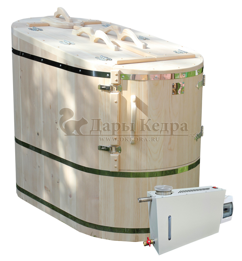 Готовый комплект «Удобный+»: кедровая бочка с парогенератором + био-защита изнутри и снаружи Готовый комплект - это полностью укомплектованный набор с фитобочкой для процедур парения. Овальная модель более просторна и удобна в использовании. Толщина стенок составляет 25 мм. Бочка оборудована откидными створками, дверцей и отверстием для головы. Верхний скос изделия делает положение головы более комфортным и улучшает обзор. Во время парения человек сидит внутри кедровой бочки, а голова находится снаружи. Благодаря этому исключается возможность перегрева. Подлокотники из кедра, встроенные ручки на створках и двери делают эксплуатацию более удобной. Парение в фитобочке благотворно влияет на организм в целом: повышается иммунитет, выводятся шлаки и токсины, улучшается работа органов тела и состояние кожи.